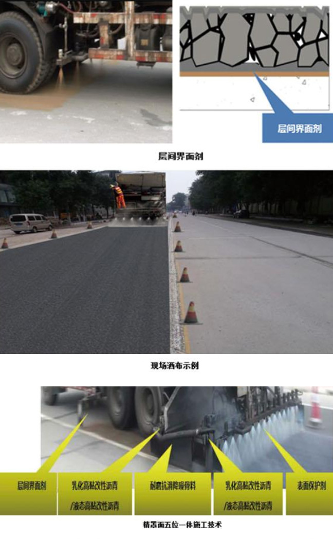 低噪抗滑功能復(fù)合型精罩面技術(shù),簡(jiǎn)稱(chēng)精罩面技術(shù)。該技術(shù)是將層間界面劑、熱塑反應(yīng)型復(fù)合改性乳化瀝青、耐磨抗滑降噪骨料、表面保護(hù)劑等通過(guò)專(zhuān)用設(shè)備同步施工到原路面,形成的路面養(yǎng)護(hù)結(jié)構(gòu)層。